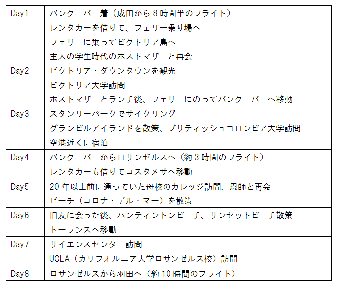 カナダ・アメリカ旅行体験記第3弾では、この旅で一体どこを訪れたのか、また小学3年生の娘の反応などをお伝えしようと思います。私たちは、ざっくりと以下のようなスケジュールで動きました。改めて書き出すと、恐ろしくタイトで、とにかく電車・飛行機・車・フェリーと移動が多かった・・・。